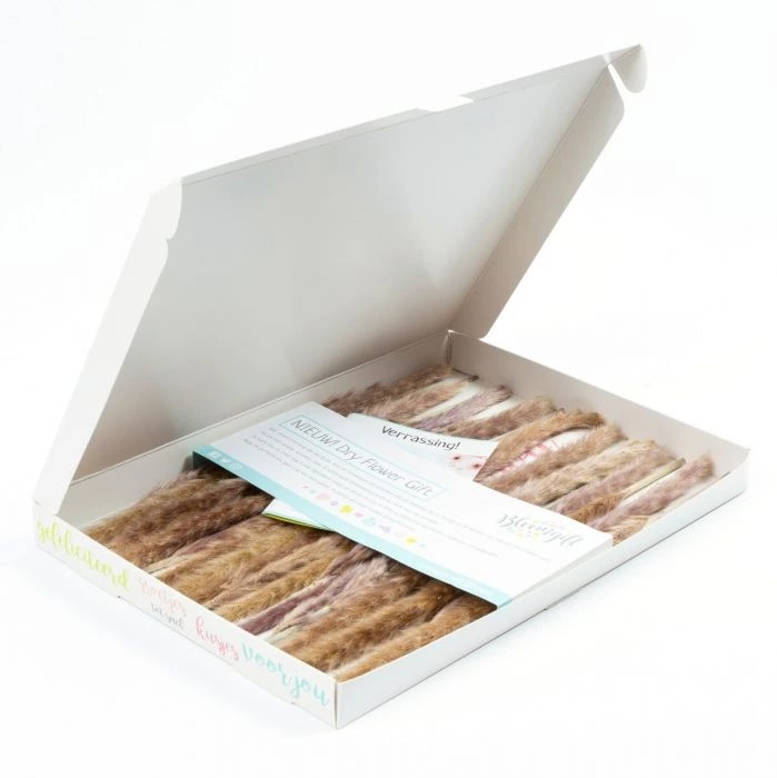 20 mini Pampas pluimen in een brievenbus verpakking. Lang houdbaar cadeau!